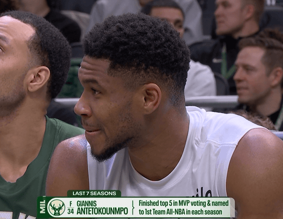 比賽期間,季都進(jìn)入轉播方打出一項關(guān)于字母哥的入選數據: