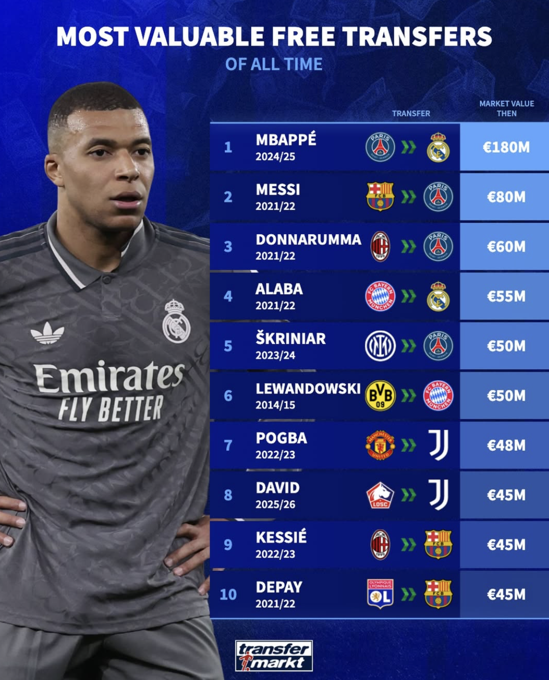 1. 姆巴佩(2024/25賽季):巴黎-> 皇馬;1.8億