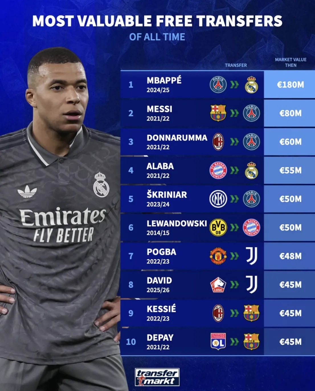 姆巴佩以當年1.8億歐的壇免身價(jià)高居榜首,梅西和多納魯馬分別以8000萬(wàn)和6000萬(wàn)排名二三位。簽時(shí)球