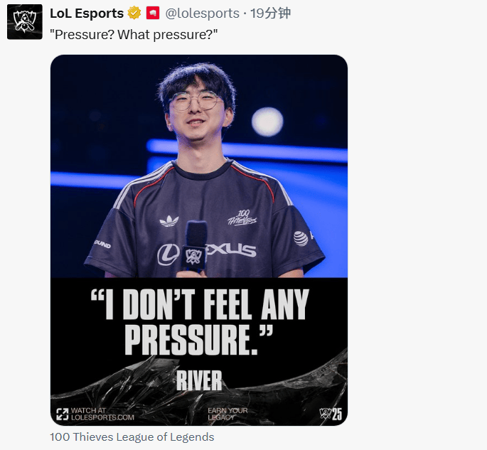 LoL Esports官方發(fā)布River選手賽前宣言海報,何壓并配文:“壓力?什么壓力?”