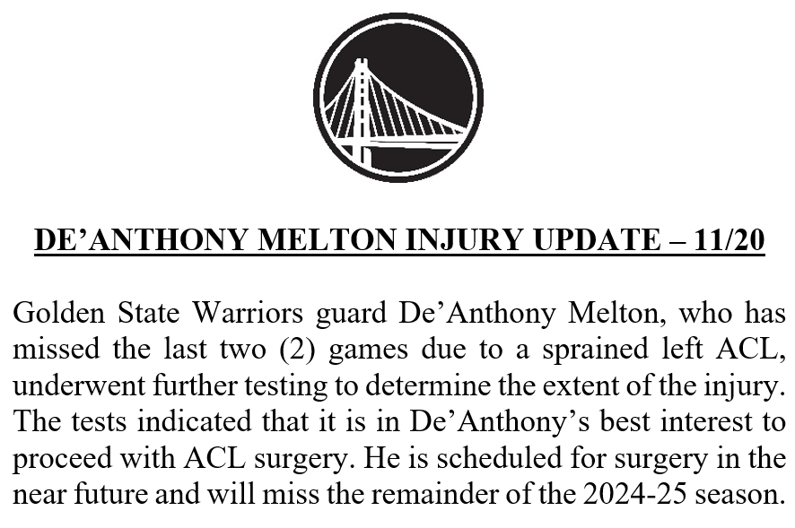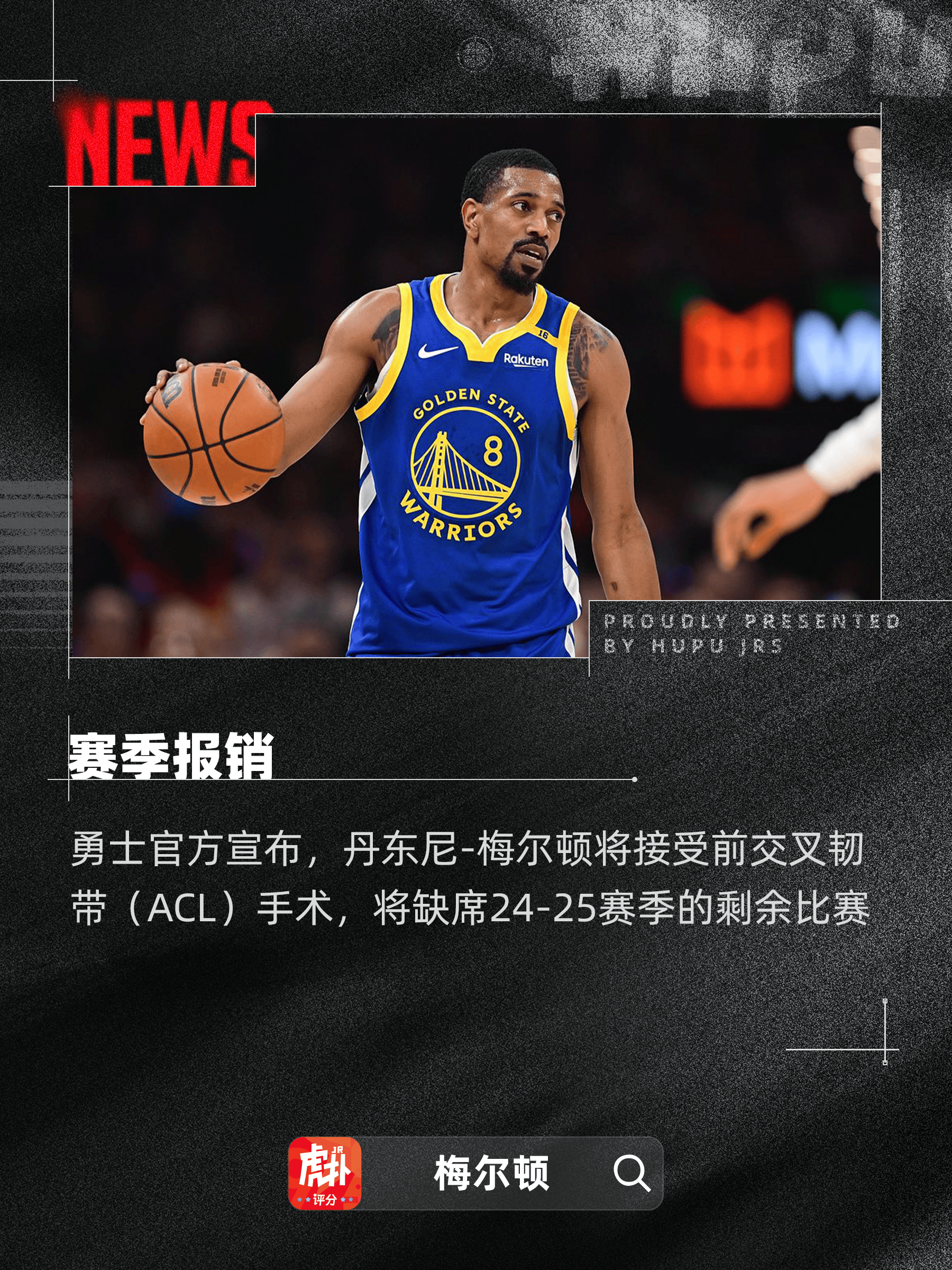 虎撲11月21日訊 勇士官方宣布,丹東尼-梅爾頓將接受前交叉韌帶(ACL)手術(shù),將缺席24-25賽季的剩余比賽。