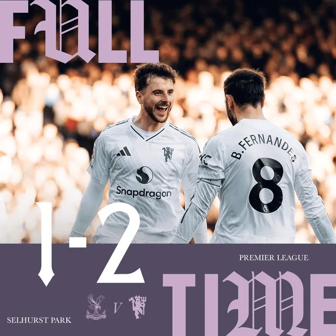 曼聯(lián)在客場(chǎng)先丟一球的情況下實(shí)現逆轉,以2-1擊敗水晶宮,攀升至英超積分榜第七位。