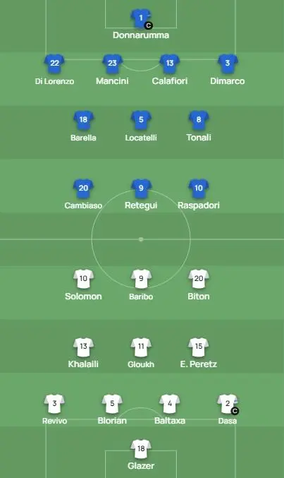 意大利首發(fā):1-多納魯馬、22-迪洛倫佐、23-曼奇尼、13-卡拉菲奧里、3-迪馬爾科、18-巴雷拉、5-洛卡特利、8-托納利、10-拉斯帕多里、9-雷特吉、20-坎比亞索