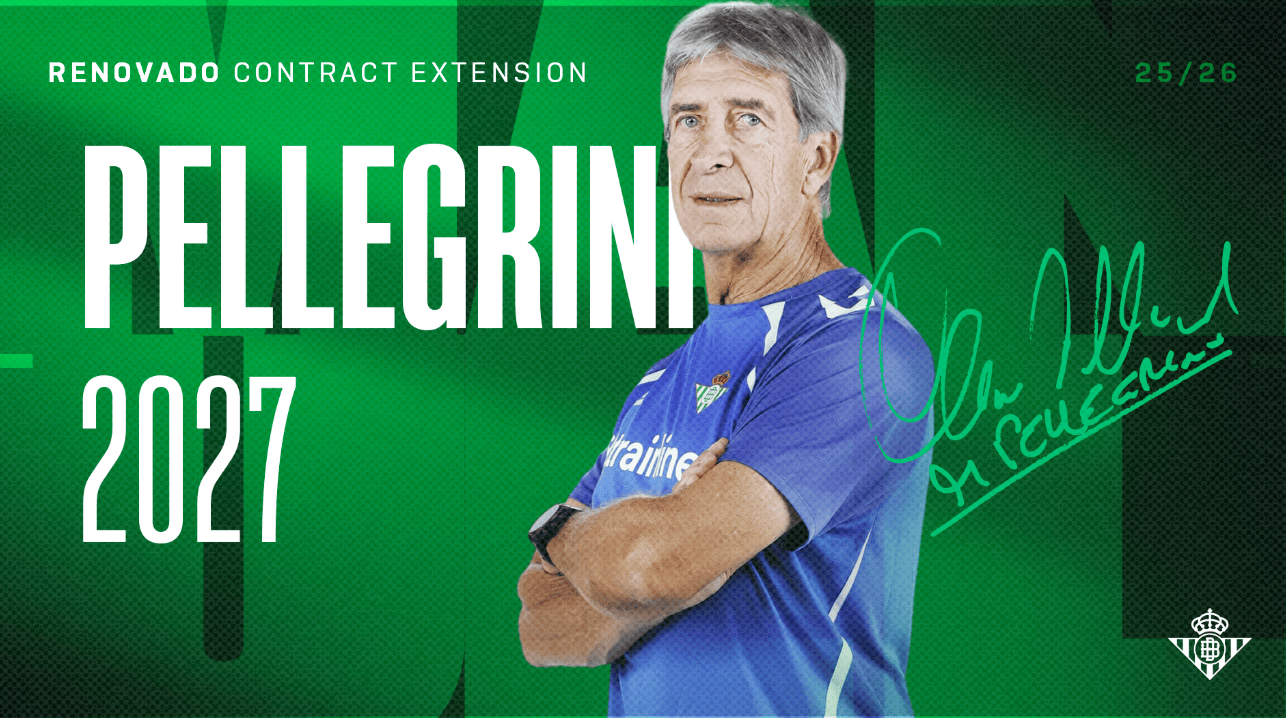 虎撲11月28日訊 皇家貝蒂斯官方宣布,將主教練曼努埃爾-佩萊格里尼的約合合同延長(cháng)一年。這樣一來(lái),這位智利主教練將執教貝蒂斯至2027年6月。