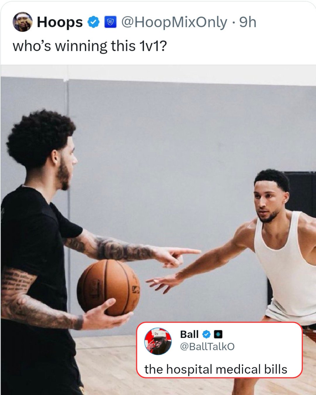 “朗佐-鮑爾和本-西蒙斯1v1,梗圖誰(shuí)會(huì )贏(yíng)?”Hoops提問(wèn)道。調侃