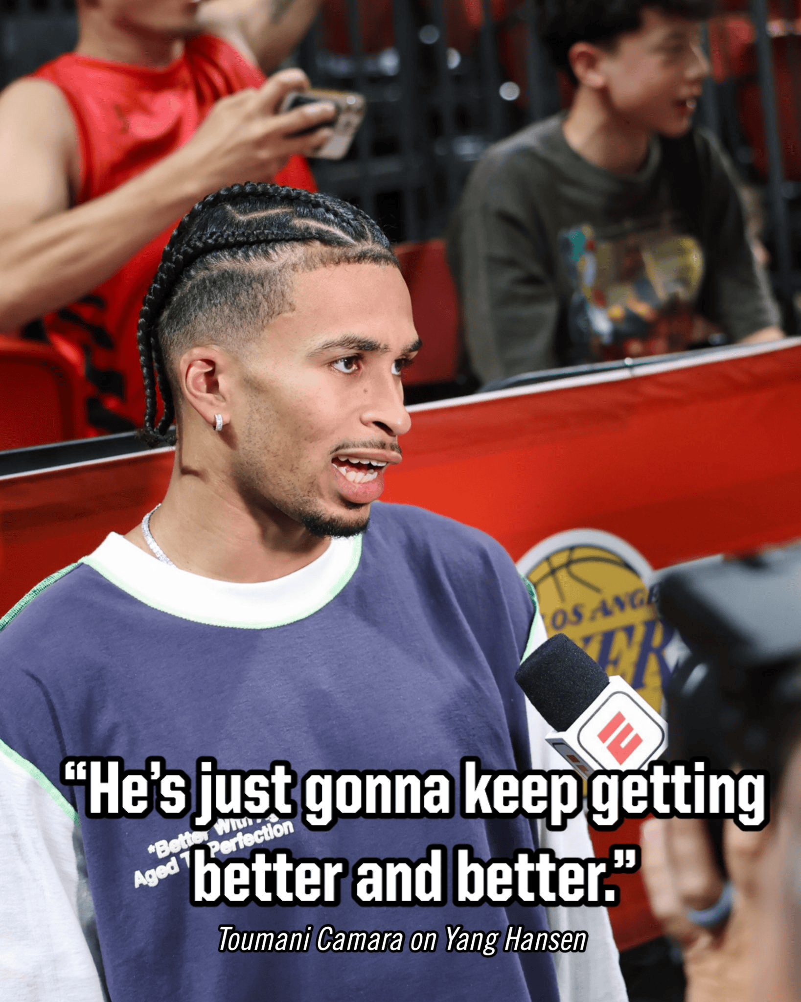 開(kāi)拓者卡馬拉場(chǎng)邊觀(guān)戰接受采訪(fǎng)談到楊瀚森表示:“他是非常賦個(gè)非常有天賦的球員,我很開(kāi)心能跟他成為隊友,馬拉他會(huì )越來(lái)越好的稱(chēng)贊?!?/p>