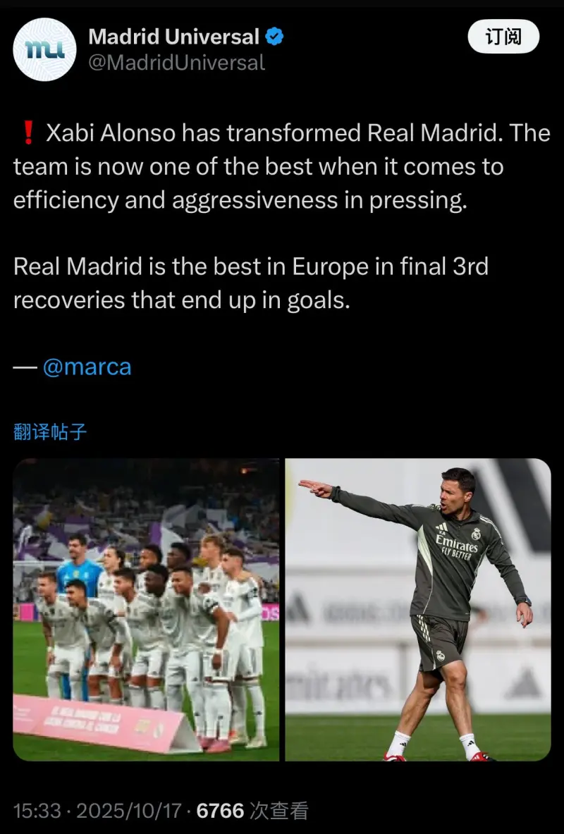 馬卡:阿隆索徹底改造了皇馬:球隊如今在壓迫效率和侵略性方面已是頂尖水平?;始荫R德里是歐洲“在進(jìn)攻三區搶下球權后最終破門(mén)”次數最多的球隊。