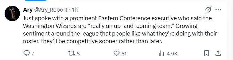 虎撲08月09日訊 美國記者Ary更新社媒,談到了奇才未來(lái)的正崛情況。