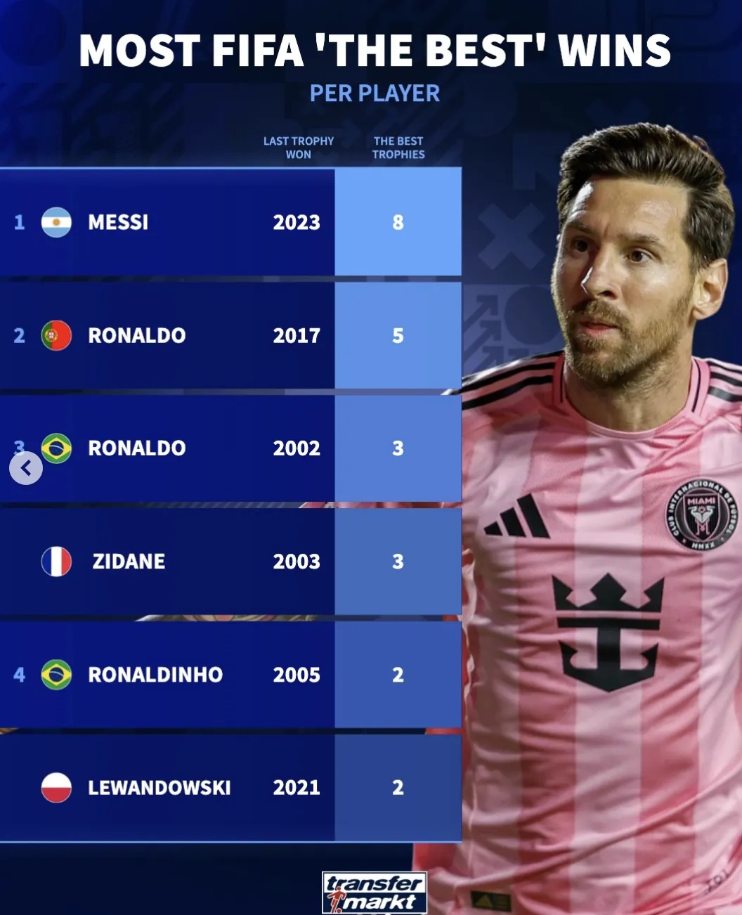 梅西總共獲獎8次居首,次數次排C羅共獲得5次排名第二。西次