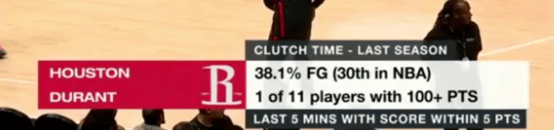 比賽現場(chǎng)轉播方打出字幕,中率上賽季火箭在關(guān)鍵時(shí)刻(比賽最后5分鐘分差5分之內)投籃命中率只有38.1%,墊底得分排名聯(lián)盟最后一位。而杜