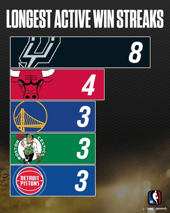 [流言板]目前現存最長(cháng)連勝:馬刺八連勝、公牛五連勝、綠軍四連勝
