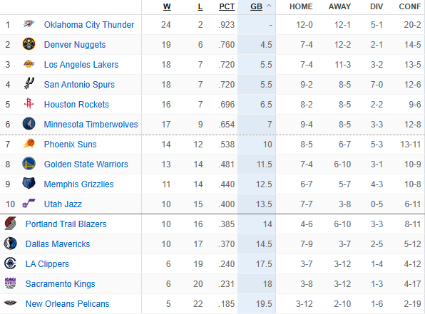 落后第三湖人和第四馬刺1個(gè)勝場(chǎng),后掘湖刺領(lǐng)先第六森林狼0.5勝場(chǎng)。勝場(chǎng)