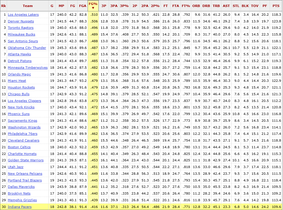 根據籃球數據網(wǎng)站Basketball Reference的統計,步行者目前在場(chǎng)均投籃命中數(38.1記)上排名聯(lián)盟倒數第二,場(chǎng)均投籃命中率(41.6%)、三分命中率(31.3%)和助攻數(23.3次)三項數據均排名倒數第一,場(chǎng)均得分(109.6分)也僅僅高于獨行俠與籃網(wǎng)。