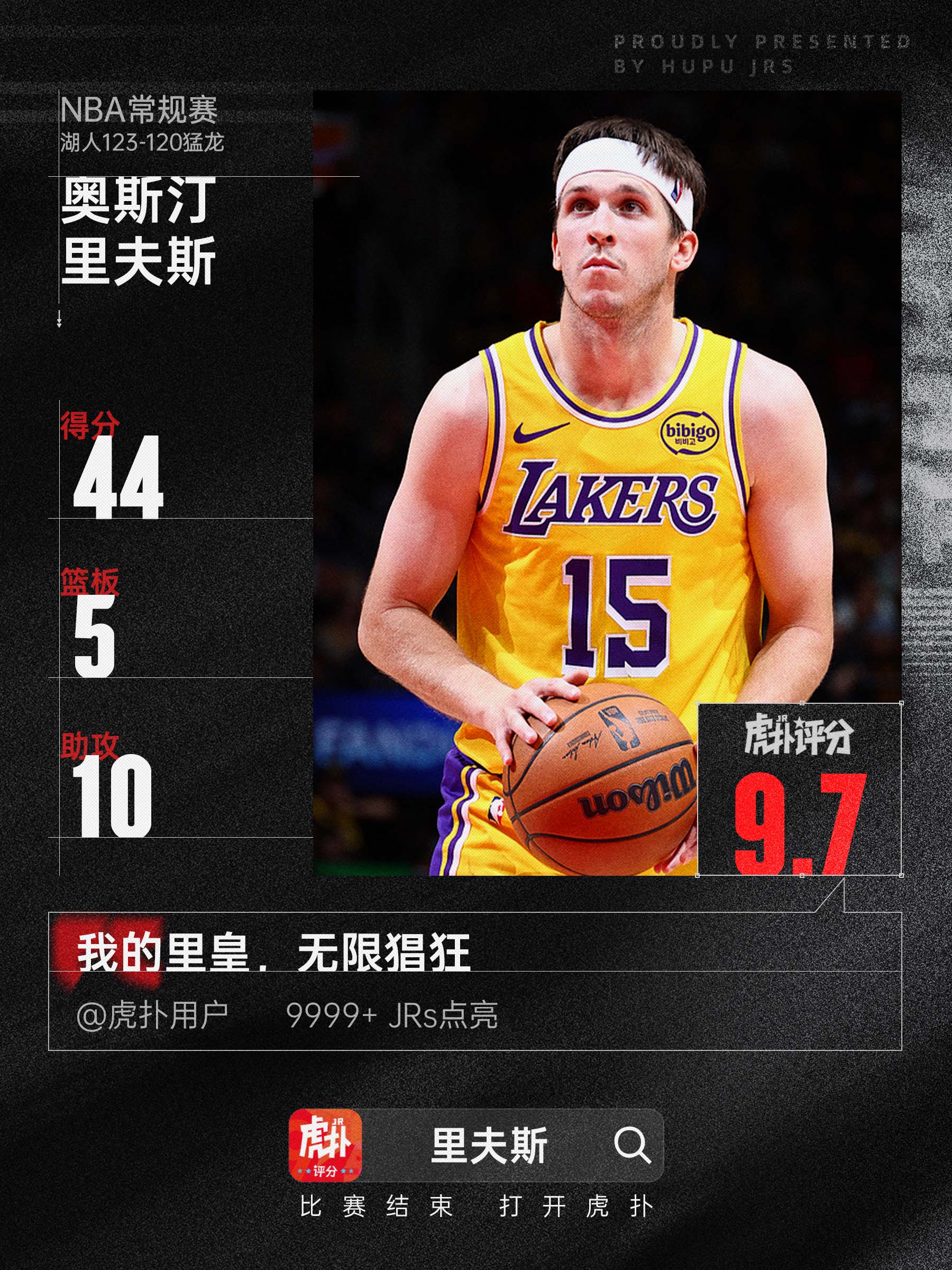 本場(chǎng)比賽,板助湖人球員奧斯汀-里夫斯出戰40分鐘,21投13中,其中三分球11投5中,罰球15投13中,得到44分5籃板11助攻。