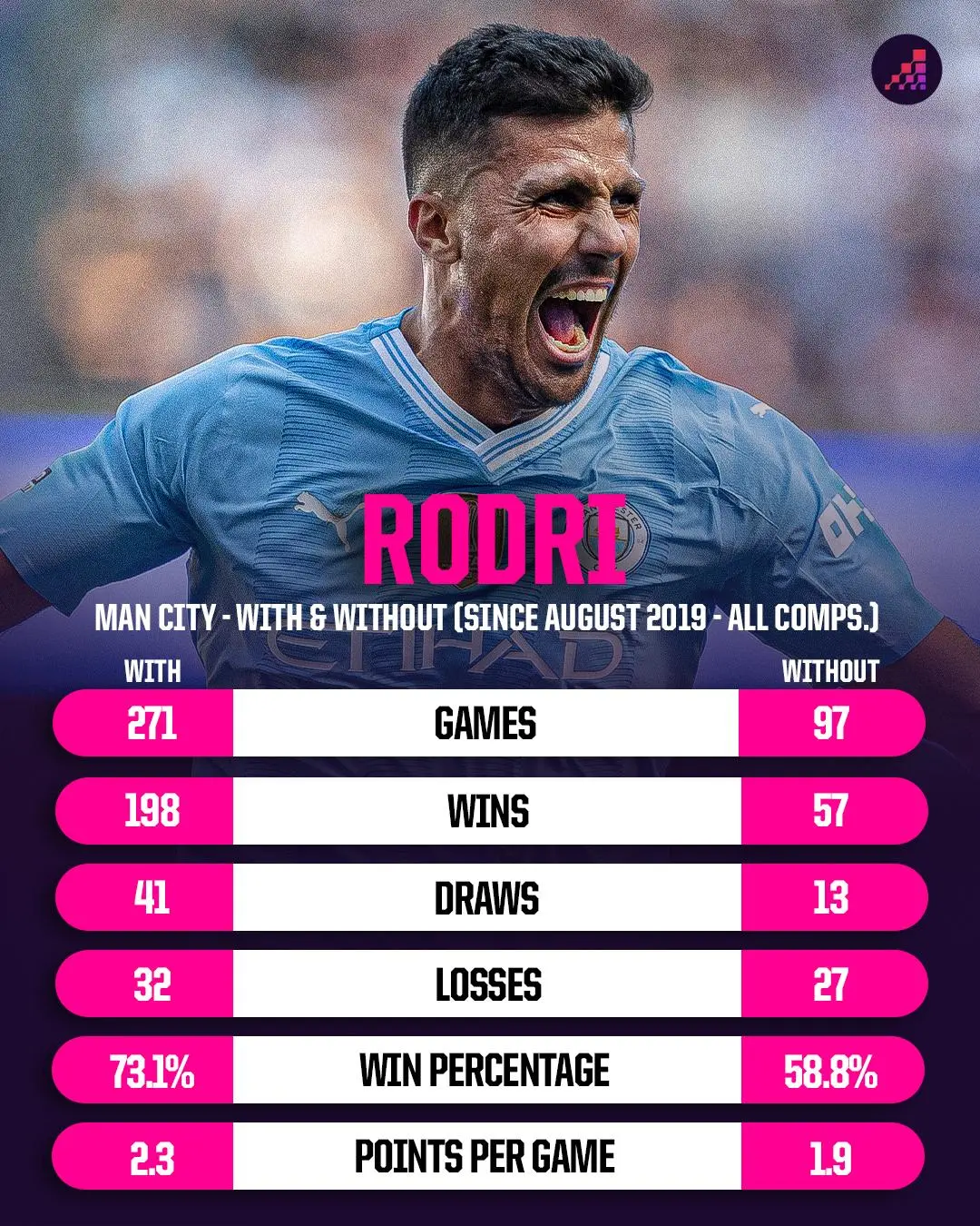 [流言板]羅德里缺陣時(shí)曼城勝率73.1%降至58.8%,場(chǎng)均2.3分降至1.9分