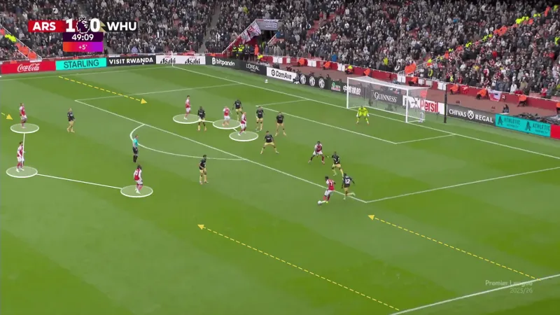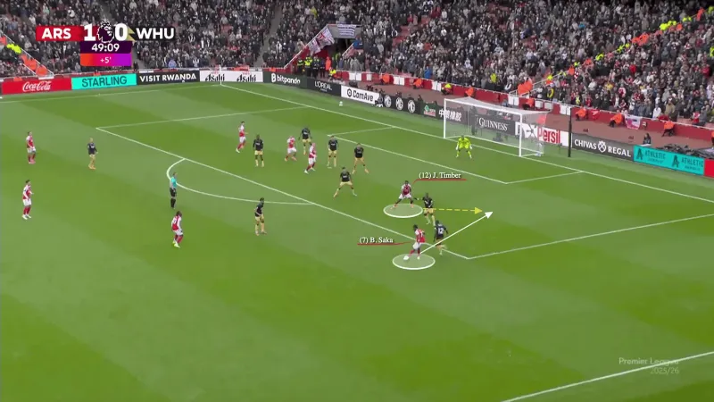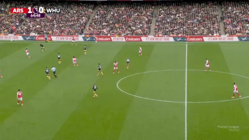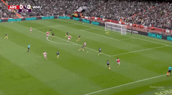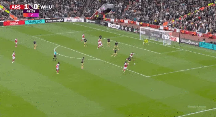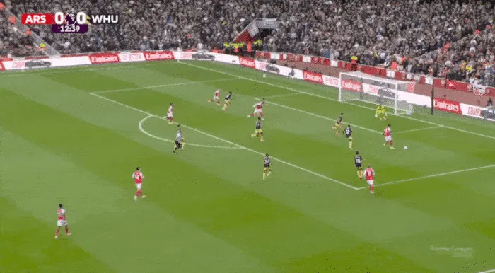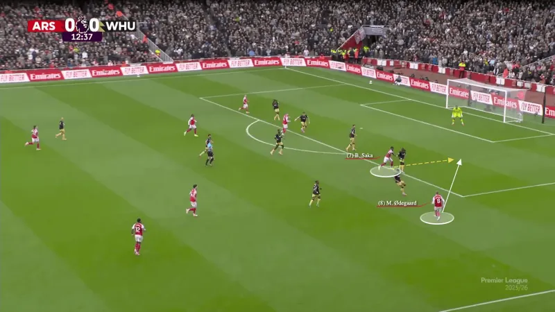 在第13分鐘,西漢姆聯(lián)得到了一個(gè)恰當的警告。厄德高拉到了邊路,薩卡則飄入了肋部。薩卡溜入盲區接球?,F在是射門(mén)的時(shí)候了,寬度被壓縮了。