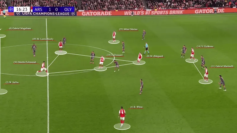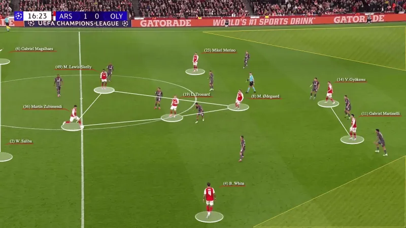 哲凱賴(lài)什、蘇維門(mén)迪、埃澤和莫斯克拉在艱難時(shí)刻都是新面孔。尼克·沃爾特梅德在加布里埃爾和拉亞的夾防中開(kāi)始了這次進(jìn)攻。球一傳短,多米諾骨牌就倒下了。