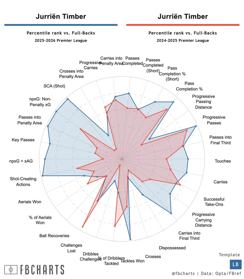 我是否期望廷貝爾以每90分鐘0.21的非點(diǎn)球預期進(jìn)球值結束本賽季,成為阿森納的領(lǐng)袖?不。其中一部分只是樣本量噪音。但他的很多肋部工作看起來(lái)確實(shí)是可持續的。而且值得記住的是,到目前為止賽程異常艱難。