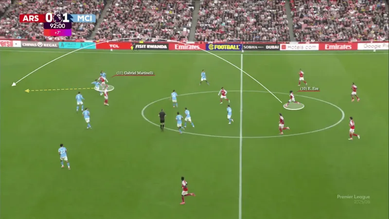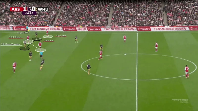 球一到達蘇維門(mén)迪,他立刻就發(fā)現了。薩默維爾猶豫是否要完全回防到薩卡身邊,兩名新球員(馬特烏斯·費爾南德斯和埃爾·哈吉·馬利克·迪烏夫)陷入了那種經(jīng)典的互相指認交流,每個(gè)人都打手勢讓對方去盯廷貝爾。這正是那種常常被低估為球隊掙扎原因的"新連接"時(shí)刻。