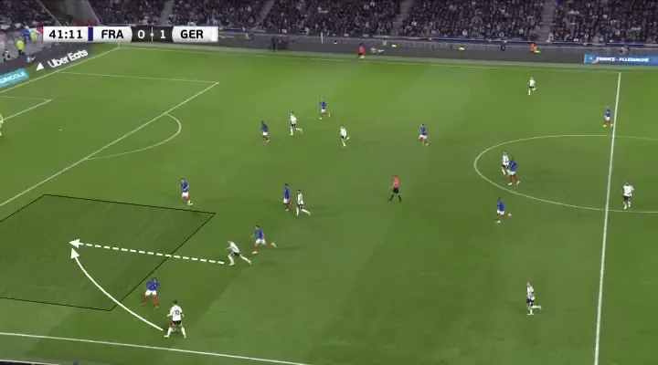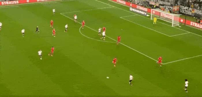 你可以在這里看到運氣被制造出來(lái):球隊以典型的寬度開(kāi)始,拉伸陣型,但隨著(zhù)進(jìn)攻提速,幾乎每個(gè)球員都向中路切入,涌入最危險的區域。憑借在進(jìn)球區域的人數和壓力優(yōu)勢,德國隊通過(guò)一個(gè)松散球強行取得了突破。