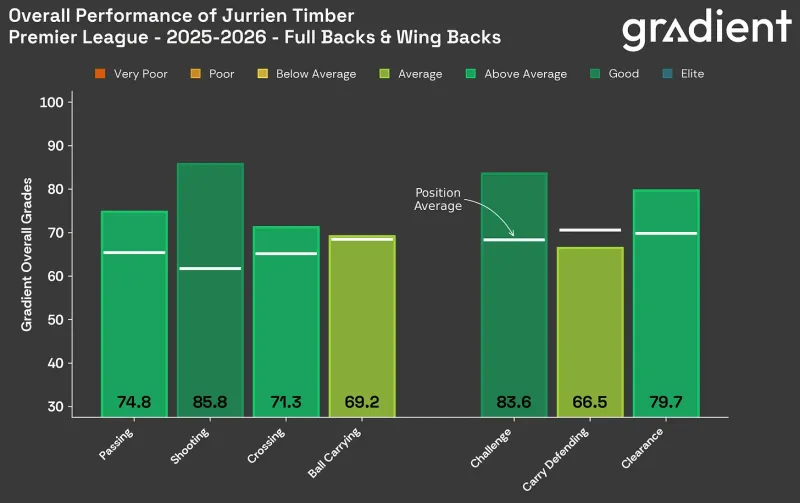 在這些區域最引人注目的存在可能是尤里恩·廷貝爾,他今年明顯提升了自己的進(jìn)攻表現。