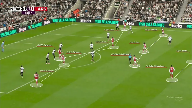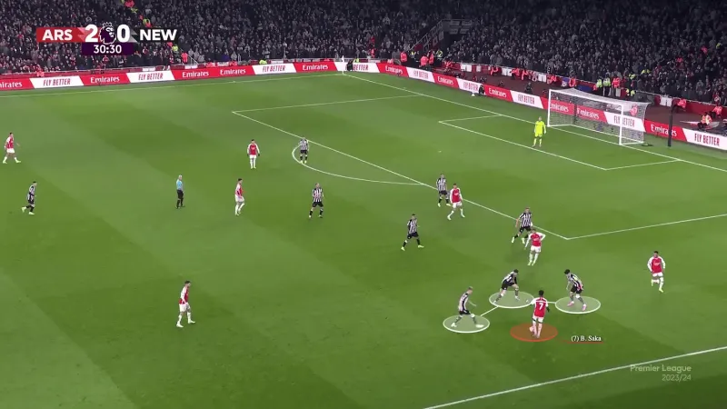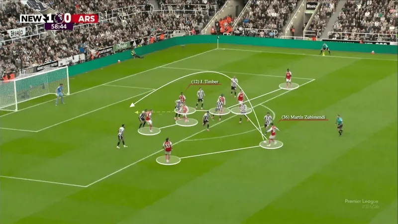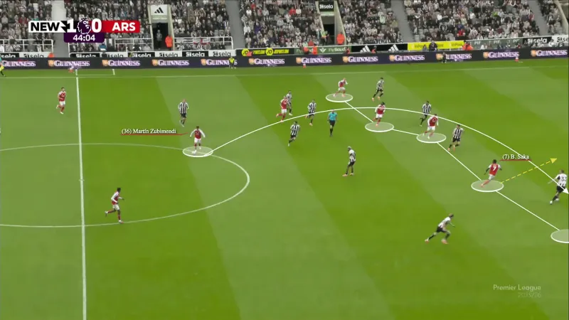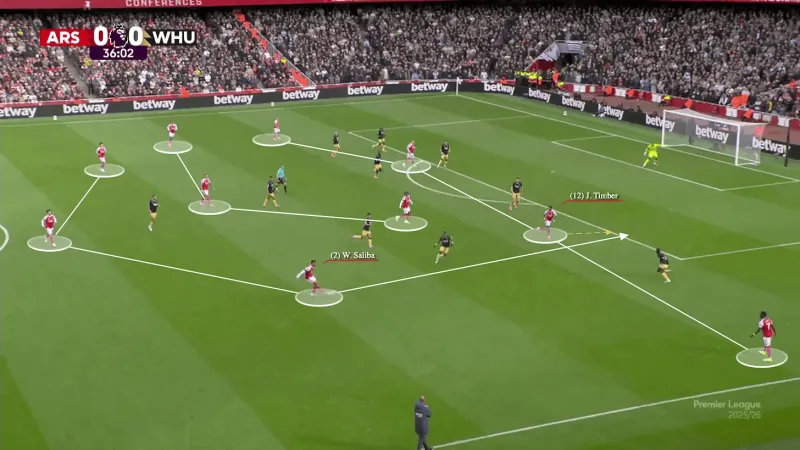 對手防守陣型的緊湊性可以追溯到更早的階段。阿森納經(jīng)常滿(mǎn)足于"簡(jiǎn)單的推進(jìn)",以中速帶球將球推進(jìn)到前場(chǎng),而沒(méi)有創(chuàng )造出真正的優(yōu)勢。一旦對手落位,節奏就慢了下來(lái),控球變成了耐心但可預測的傳導:從一側到另一側,等待著(zhù)在對陣富勒姆和紐卡斯爾這樣的球隊時(shí)不一定出現的裂縫。