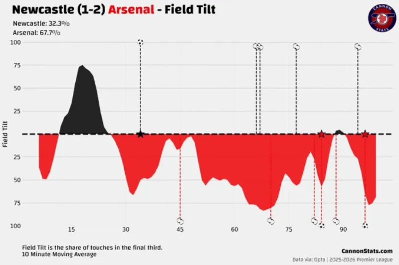 比賽狀態(tài)、戰術(shù)意圖和表現質(zhì)量共同作用,使得對陣紐卡斯爾時(shí)場(chǎng)上的傾斜度看起來(lái)像這樣( CannonStats):