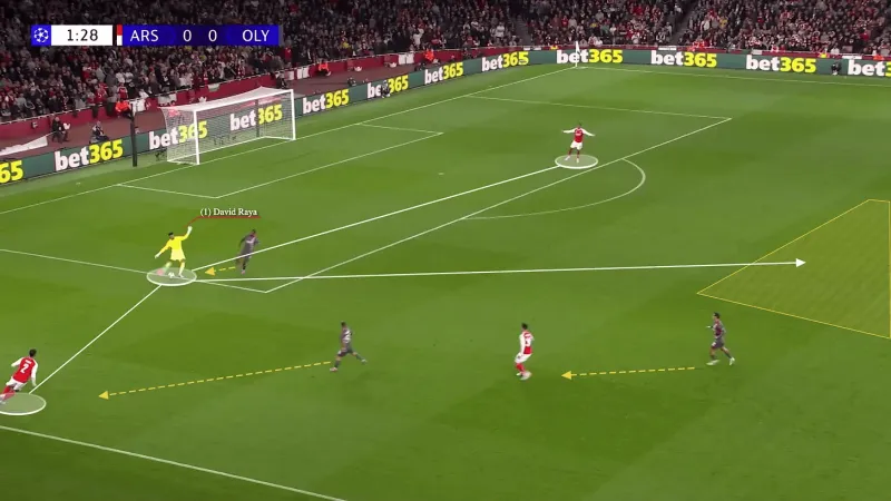 這里,在第2分鐘,薩利巴幫助贏(yíng)回球權,并讓球隊完全回傳給拉亞重新組織。本·懷特在右側保持寬度,三名逼搶球員對上了三名接球球員。拉亞繞過(guò)了他的盯防對象: