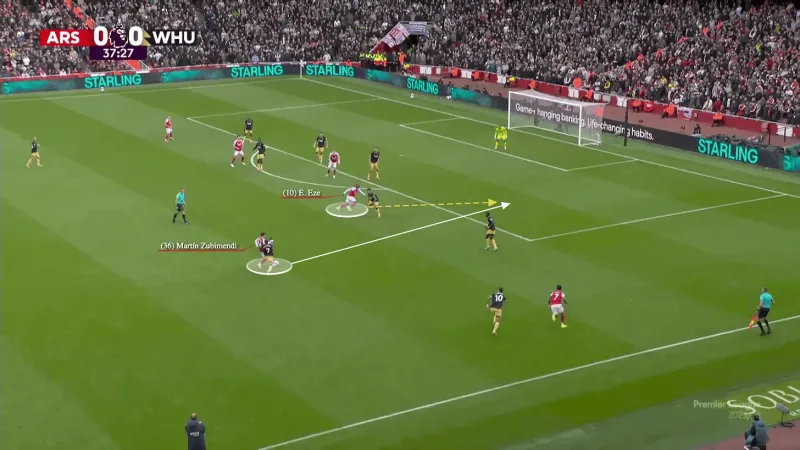 接下來(lái),看看阿森納是如何突破的。有蘇維門(mén)迪在場(chǎng)上,埃澤通過(guò)肋部推進(jìn),為一個(gè)直傳球進(jìn)行對角線(xiàn)跑動(dòng)。