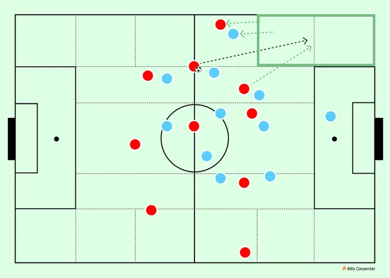從那時(shí)起,進(jìn)攻方式通常圍繞著(zhù)邊路球員喂球給插入肋部的跑動(dòng)者,就像這樣。最靠邊的球員引開(kāi)邊后衛,防守球員之間的通道打開(kāi),一個(gè)有活力的球員沖入其中,正如我們在這里從The Football Analyst看到的: