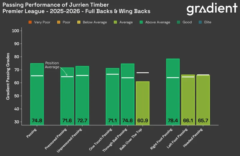 • 隨著(zhù)蘇維門(mén)迪的加入,我曾希望看到阿森納更多地打地面配合,在深層組織進(jìn)攻中撕裂對手,在進(jìn)攻三區創(chuàng )造優(yōu)勢。相反,他成了我們比較"我行我素(YOLO)"的球員之一。與整個(gè)聯(lián)賽的趨勢一致,阿森納的短傳嘗試次數下降了(每場(chǎng)約減少28次)而中長(cháng)傳嘗試次數增加了(長(cháng)傳從每場(chǎng)53.2次增加到64.7次,完成率提高到53.4%)。