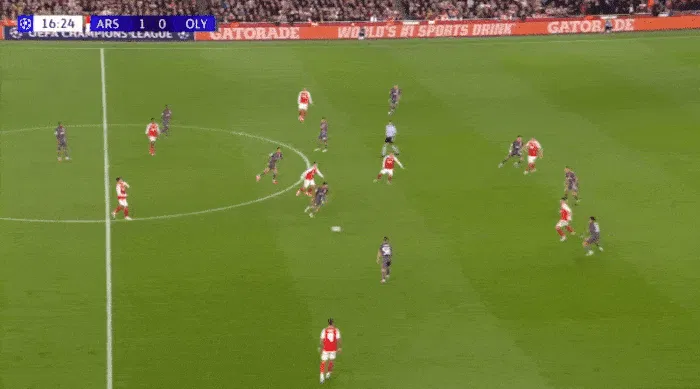這變成了一場(chǎng)數量游戲。在最近幾周最好的進(jìn)攻片段之一中,阿森納占據了所有五個(gè)進(jìn)攻通道,第二線(xiàn)有三名球員,中衛位于其后。這幾乎就是一個(gè)教科書(shū)般的2-3-5陣型,只是位置更靠前,并向有球側傾斜。