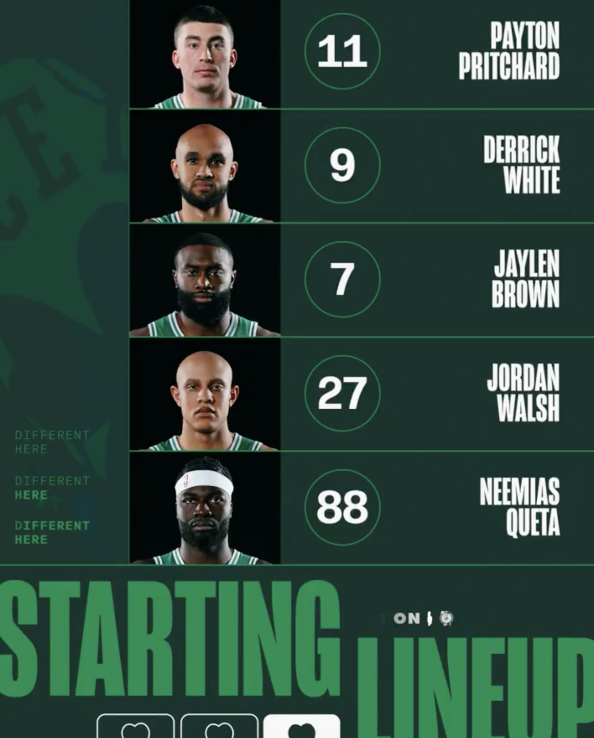 凱爾特人首發(fā):普里查德、特杰懷特、流言里查倫杰倫-布朗、板凱沃爾什、爾特克塔