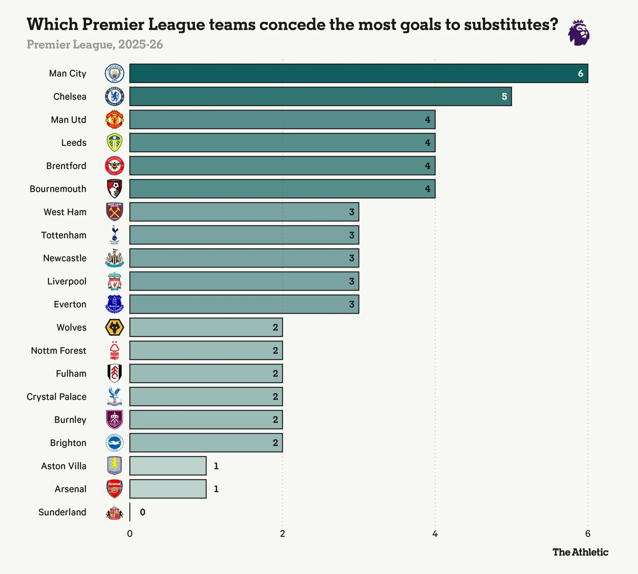 相反,對手的替補球員在對陣曼城的比賽中表現最為出色。繼周二薩穆埃爾-楚克烏澤為富勒姆梅開(kāi)二度之后,對手的替補球員已經(jīng)攻破曼城球門(mén)六次,是聯(lián)賽中最多的。