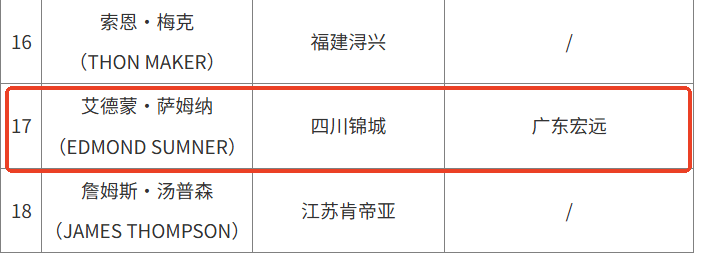 虎撲11月28日訊 CBA官方更新外援優(yōu)先續約權信息:薩姆納續約權自四川被交易至廣東。