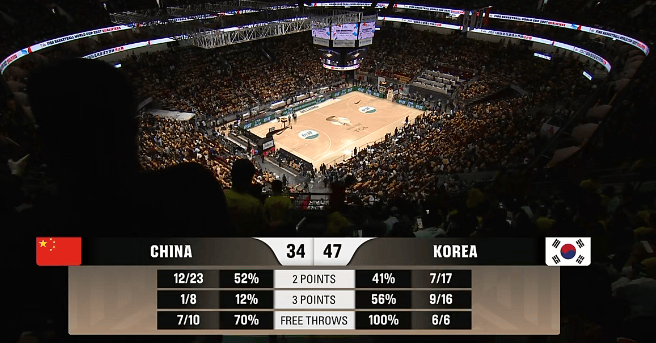 第二節比賽結束,重分中國中國男籃34-47落后韓國男籃。流言籃預廖寧李賢