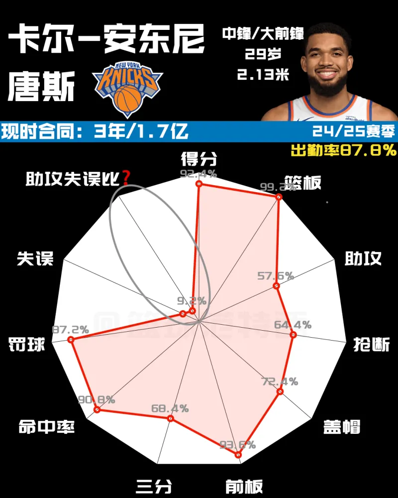 在這個(gè)前提下,我們也許可以期待唐斯在本就高產(chǎn)高效的基礎上,再把自己的助攻效率給提上來(lái),畢竟他本身就是一名有傳球手法的全能內線(xiàn)。
