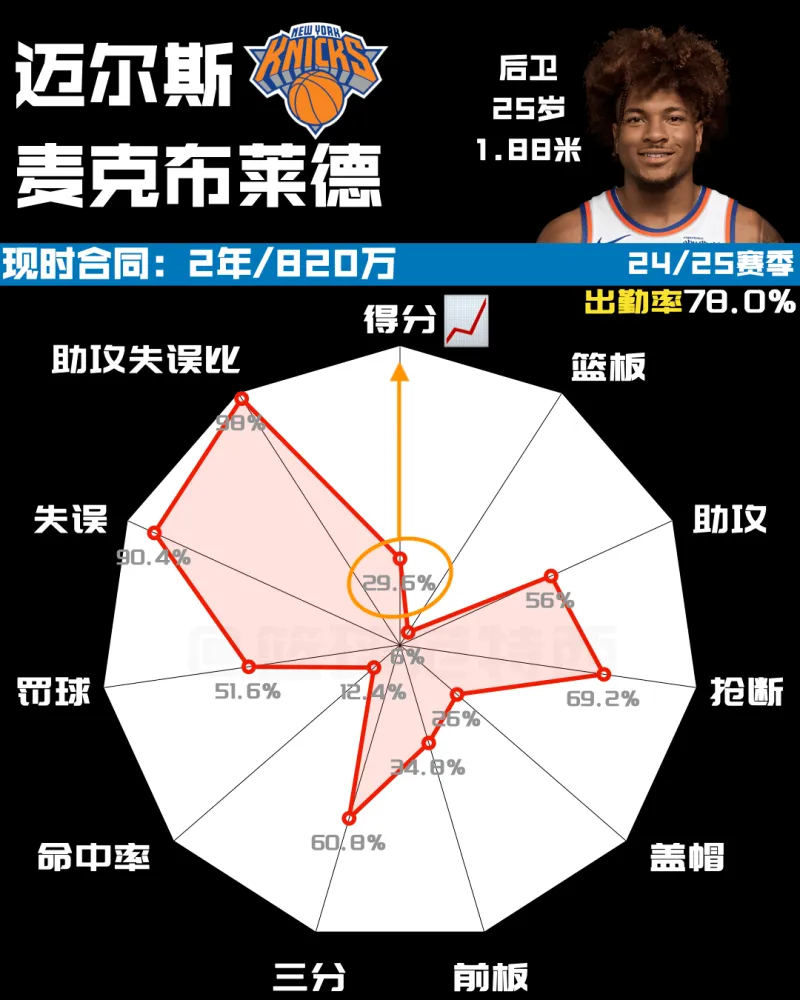 而看球員卡也不難發(fā)現,一個(gè)得分爆發(fā)力極強的小后衛,得分只在聯(lián)盟不到30%的區間,說(shuō)明還有很大的提升空間。