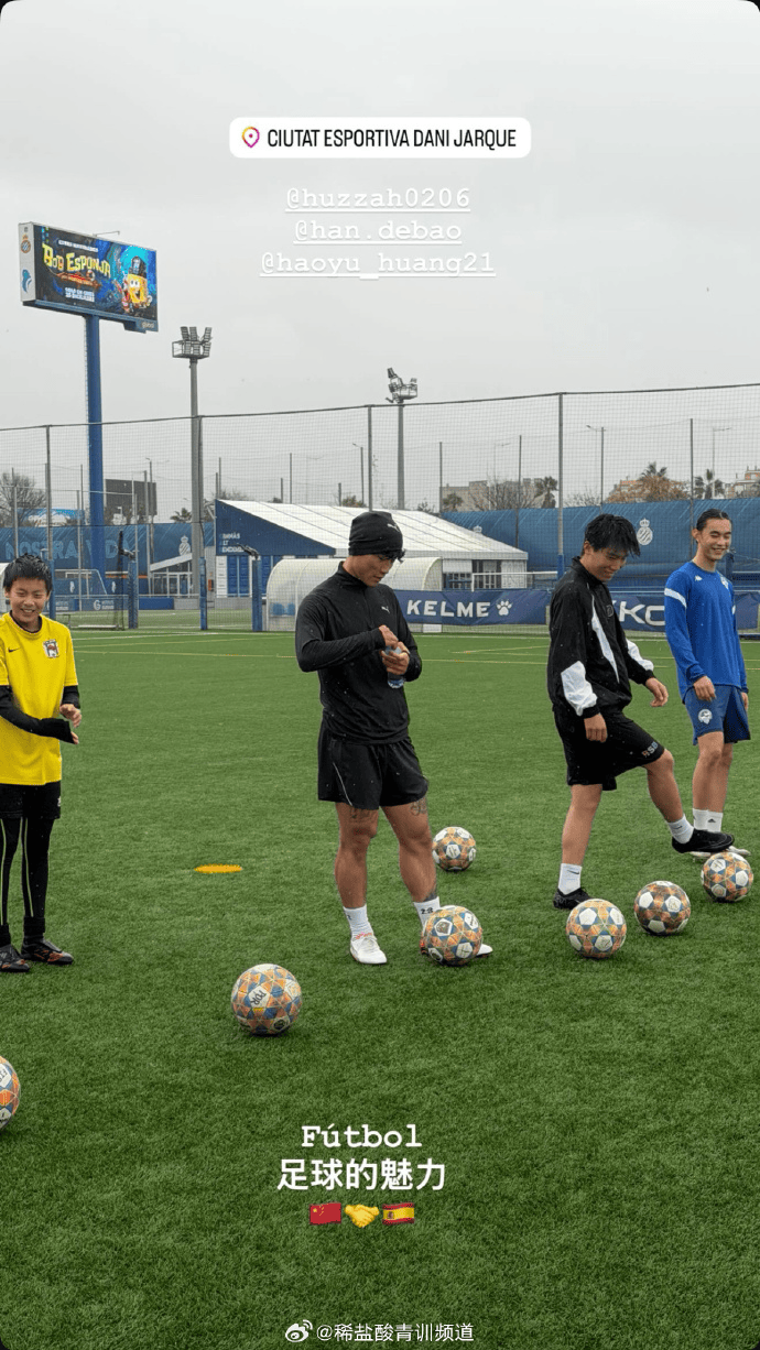 該博主寫(xiě)道:謝文能現身西班牙人訓練基地,板謝包括2008年齡段韓德寶在內的現身西班多名中國小球員一同訓練。