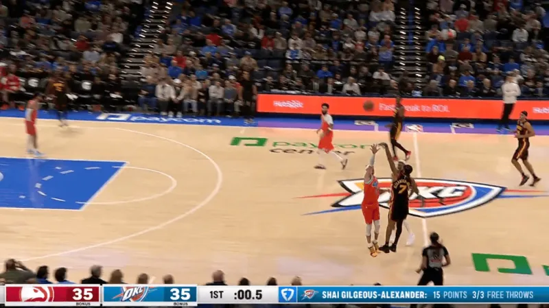 虎撲12月30日訊 在今日老鷹客場(chǎng)129-140不敵雷霆的比賽里,老鷹球員尼基爾-亞歷山大-沃克在比賽首節最后命中了一記半場(chǎng)壓哨三分。中半左手真神之筆