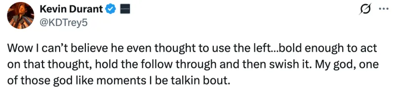 火箭球員凱文-杜蘭特轉發(fā)了沃克這記遠投,并評論寫(xiě)道:“哇,我簡(jiǎn)直不敢相信他居然想到用左手……而且還大膽地直接出手,保持投籃動(dòng)作,然后一蹴而就。我的天啊,這就是我說(shuō)的神來(lái)之筆?!?/p>