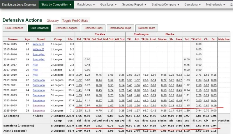 這一場(chǎng)是德容少有的帶著(zhù)袖標被夸改變的比賽,然而實(shí)際上呢?有所改善,但是沒(méi)有改變。24-25德容的防守處于他在巴薩的平均水準,25-26前幾場(chǎng)上漲到了23-24的巔峰水準,但仍然是6號位不及格水準。